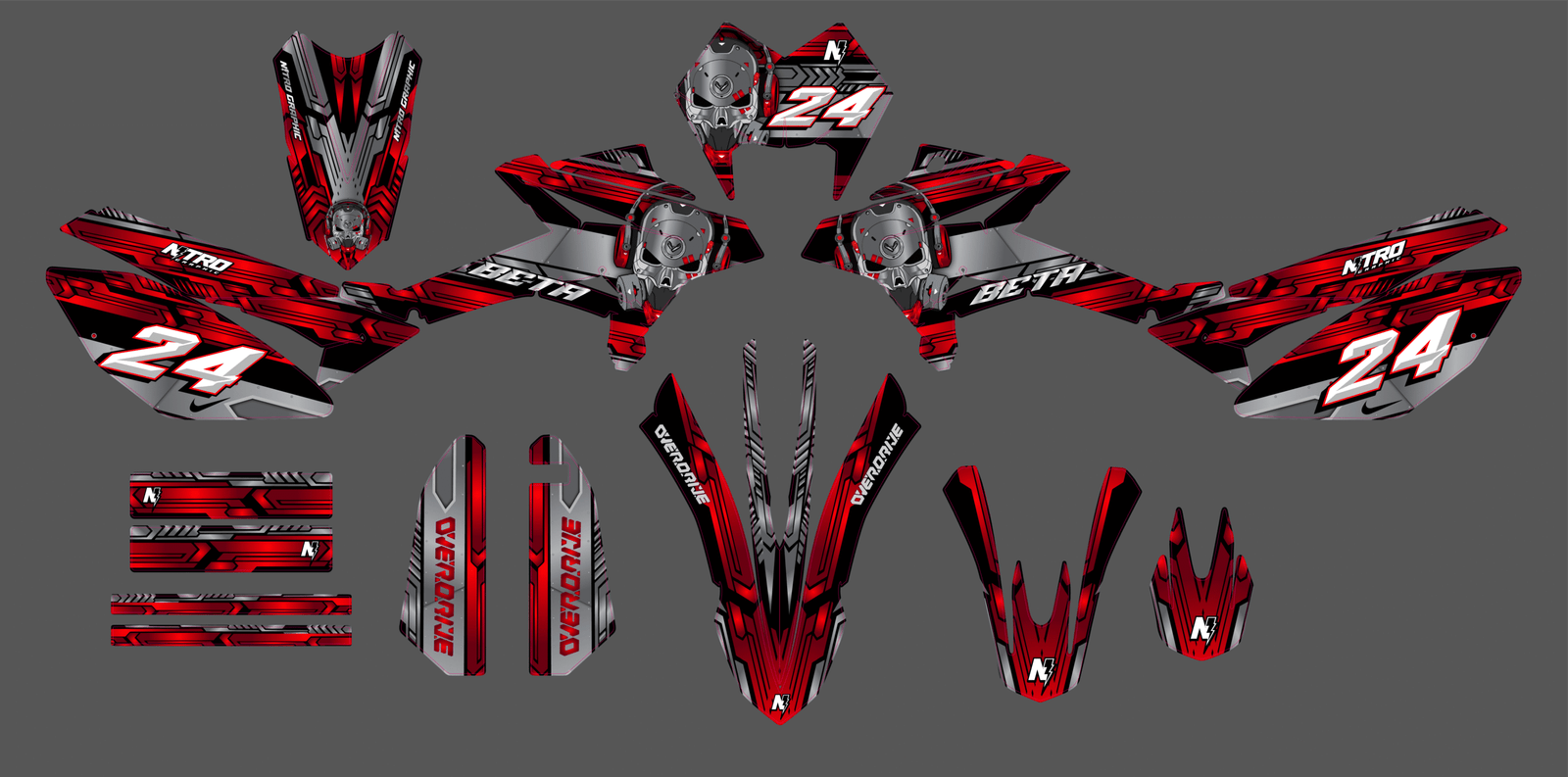 Transform your Beta RR 50 motorcycle into a one-of-a-kind masterpiece with our Pre-Made Graphics Kit Decal Design. Perfectly tailored for Beta RR 50 models from 2011 to 2020, the ‘Red Overdrive Robots’ style offers a bold and futuristic aesthetic that sets your bike apart from the crowd. Whether you’re an enthusiast looking for an edgy look or a racer prioritizing style and visibility, this graphics kit is the ideal upgrade for your ride.