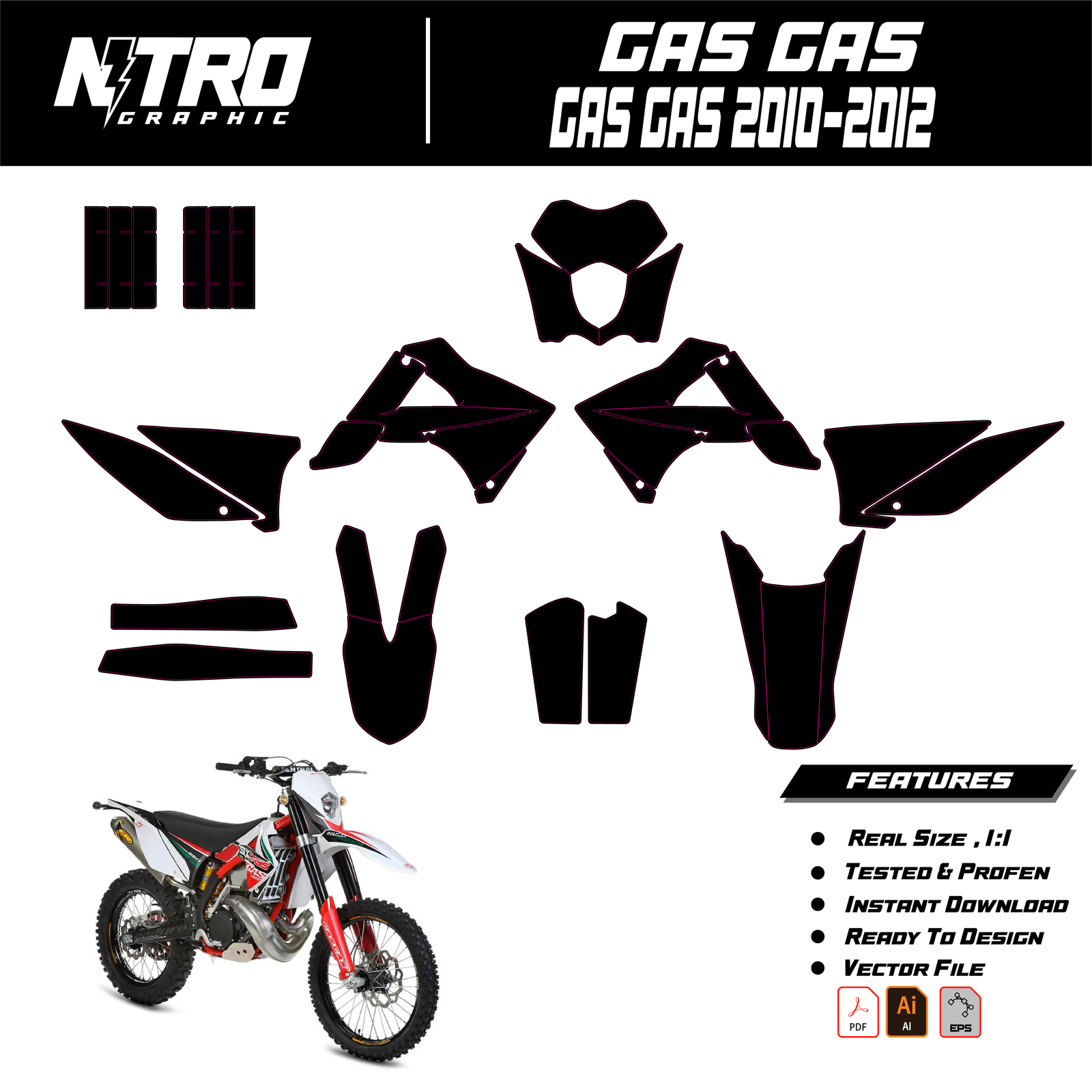 Our GasGas 2010-2012 Templates are manufactured to be easily placed on your vehicle and make it 100% unique. Our Vector Template is available in digital format. It is designed to be simply used with your graphic design software (Illustrator, Photoshop, Corel Draw, etc.).