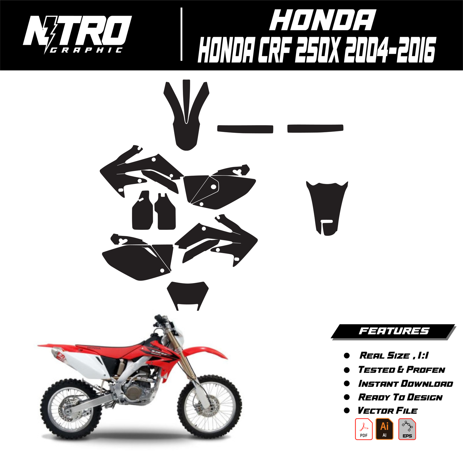 Our HONDA CRF 250X 2004-2016 Templates are manufactured to be easily placed on your vehicle and make it 100% unique. Our Vector Template is available in digital format. It is designed to be simply used with your graphic design software (Illustrator, Photoshop, Corel Draw, etc.).
