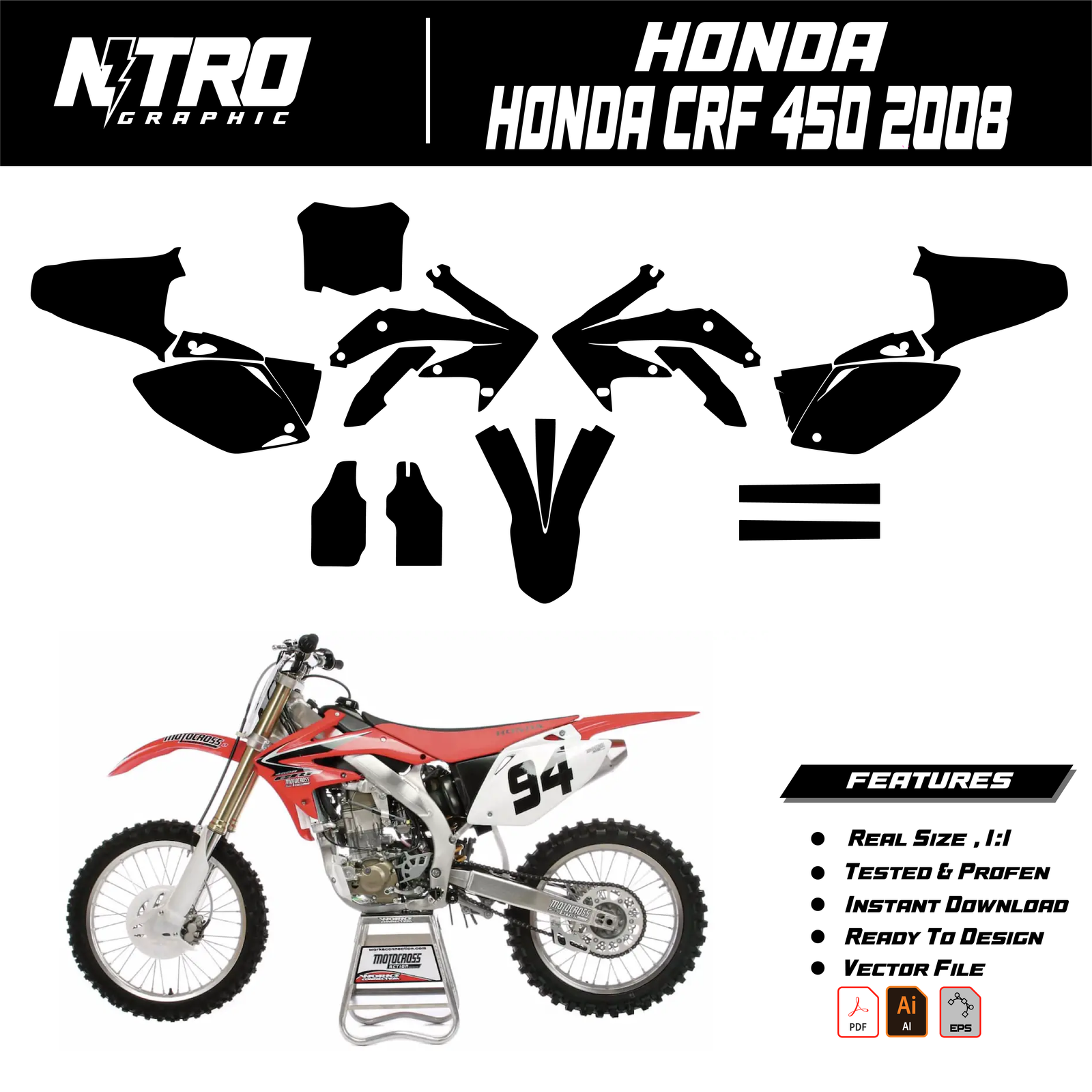 Our HONDA CRF 450 2008 Templates are manufactured to be easily placed on your vehicle and make it 100% unique. Our Vector Template is available in digital format. It is designed to be simply used with your graphic design software (Illustrator, Photoshop, Corel Draw, etc.).
