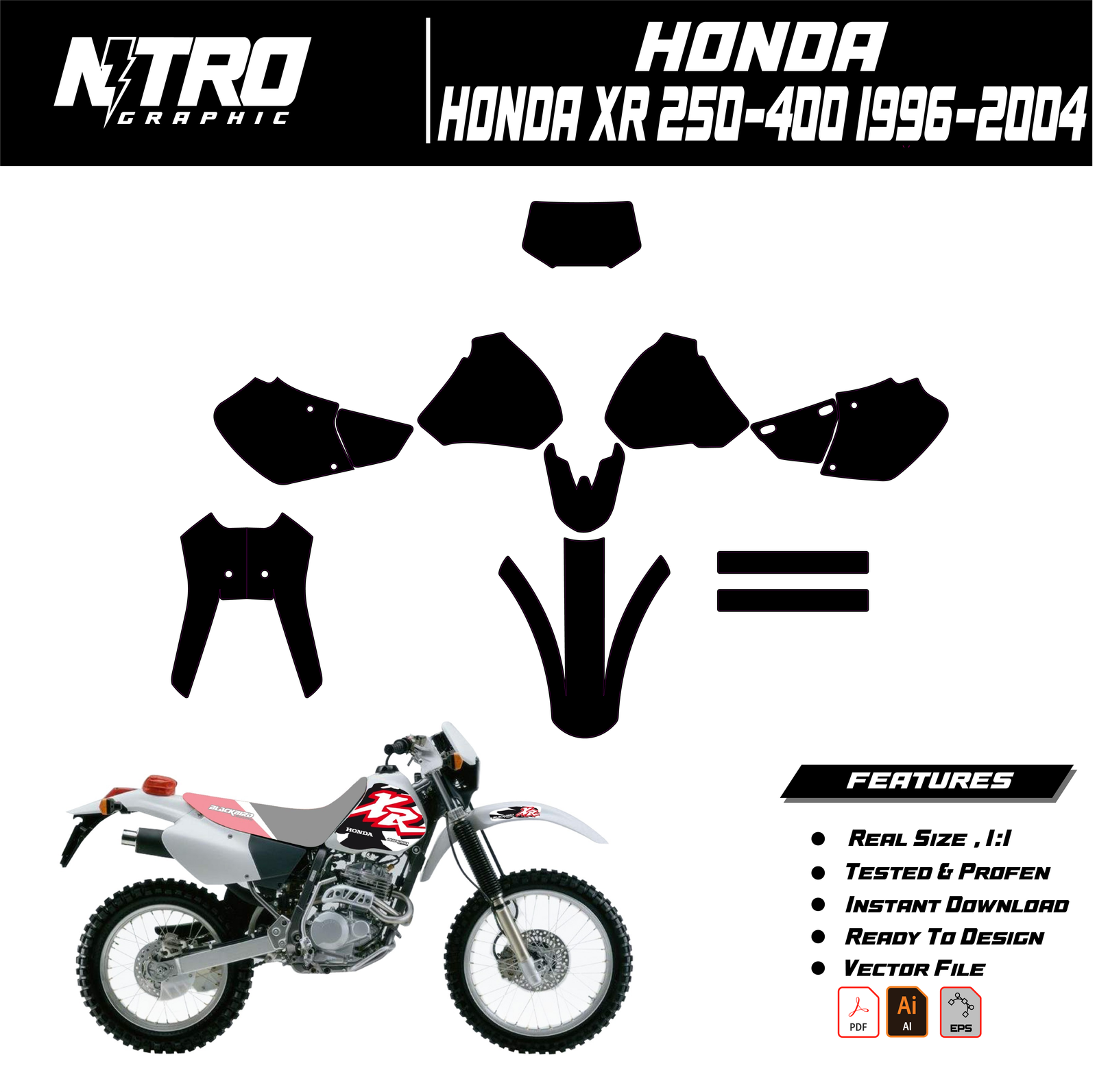 Our HONDA XR 250-400 1996-2004 Templates are manufactured to be easily placed on your vehicle and make it 100% unique. Our Vector Template is available in digital format. It is designed to be simply used with your graphic design software (Illustrator, Photoshop, Corel Draw, etc.).
