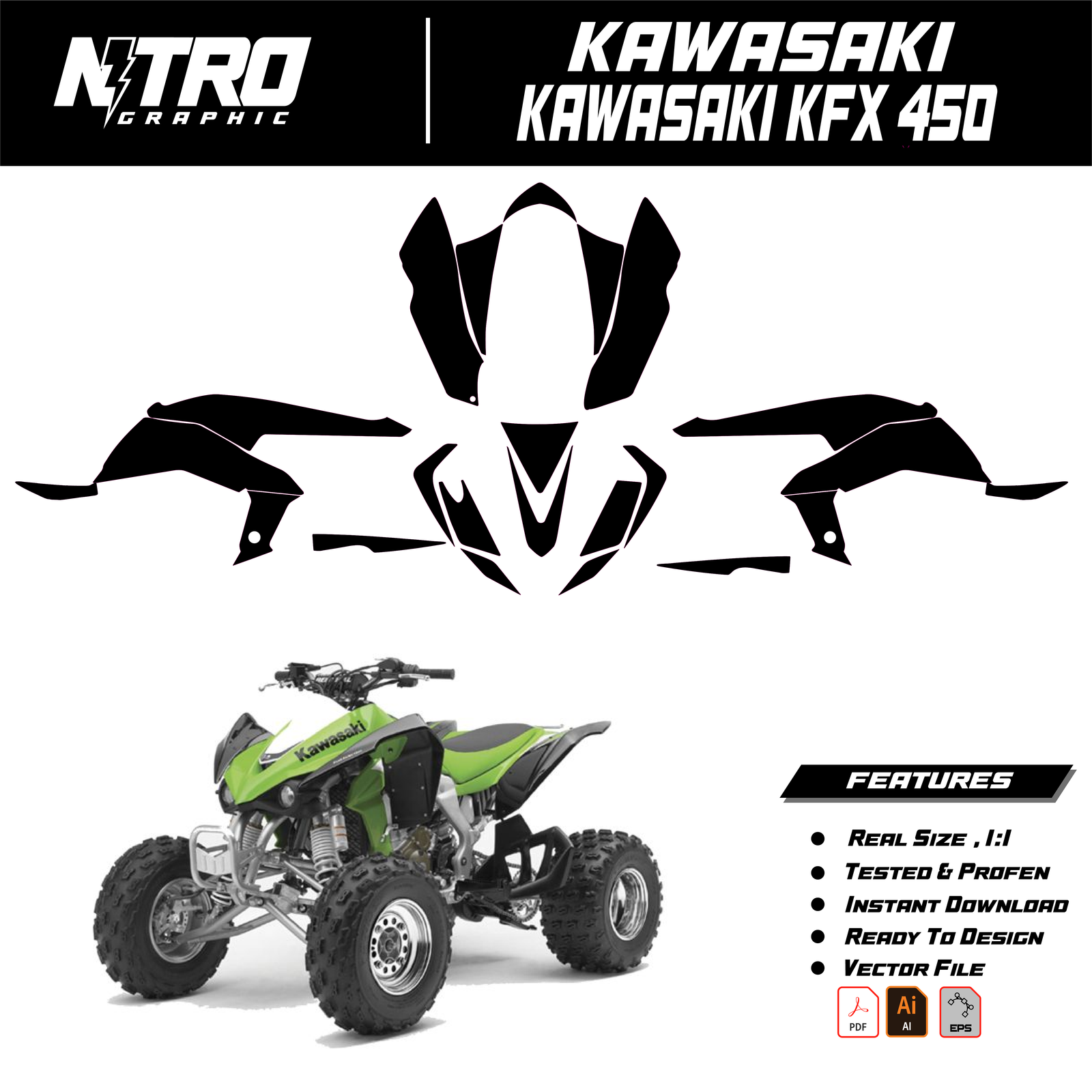 Our Kawasaki KFX 450 Templates are manufactured to be easily placed on your vehicle and make it 100% unique. Our Vector Template is available in digital format. It is designed to be simply used with your graphic design software (Illustrator, Photoshop, Corel Draw, etc.).
