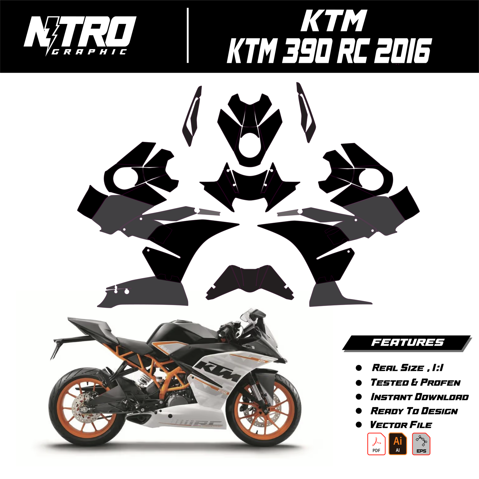 Our KTM 390 RC 2016 Templates are manufactured to be easily placed on your vehicle and make it 100% unique. Our Vector Template is available in digital format. It is designed to be simply used with your graphic design software (Illustrator, Photoshop, Corel Draw, etc.).