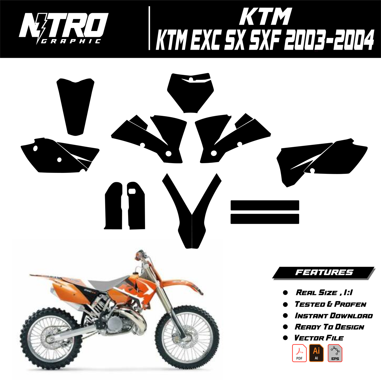 Our KTM EXC SX SXF 2003-2004 Templates are manufactured to be easily placed on your vehicle and make it 100% unique. Our Vector Template is available in digital format. It is designed to be simply used with your graphic design software (Illustrator, Photoshop, Corel Draw, etc.).