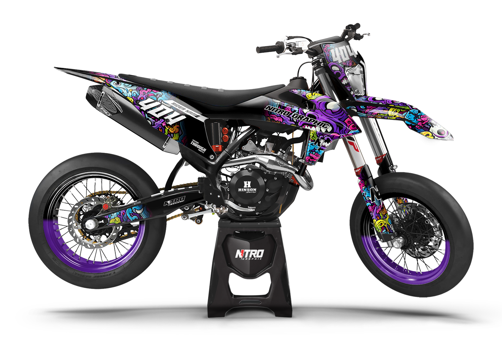 Full Graphics Kits include pre-designed template graphics for – Tank Shrouds / Fuel Tank, Side Number Plates, Airbox, Rear Fender, Front Fender, Front Number Plate Fork Guards, and Swingarms (Contents may vary dependant on Type / Model selected).