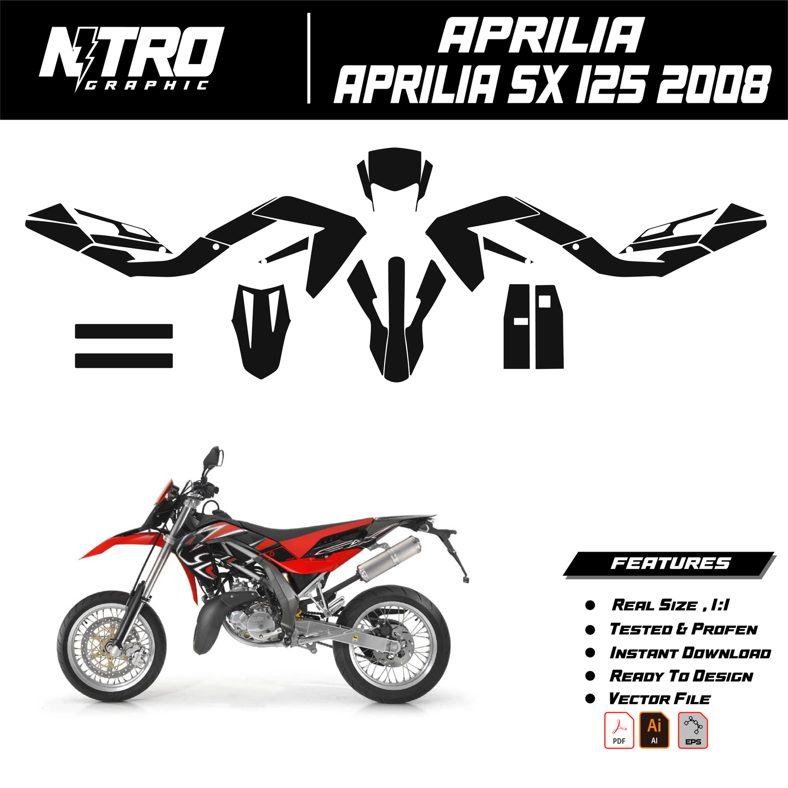 Our Template APRILIA SX 125 2008 Templates are manufactured to be easily placed on your vehicle and make it 100% unique. Our Vector Template is available in digital format. It is designed to be simply used with your graphic design software (Illustrator, Photoshop, Corel Draw, etc.).