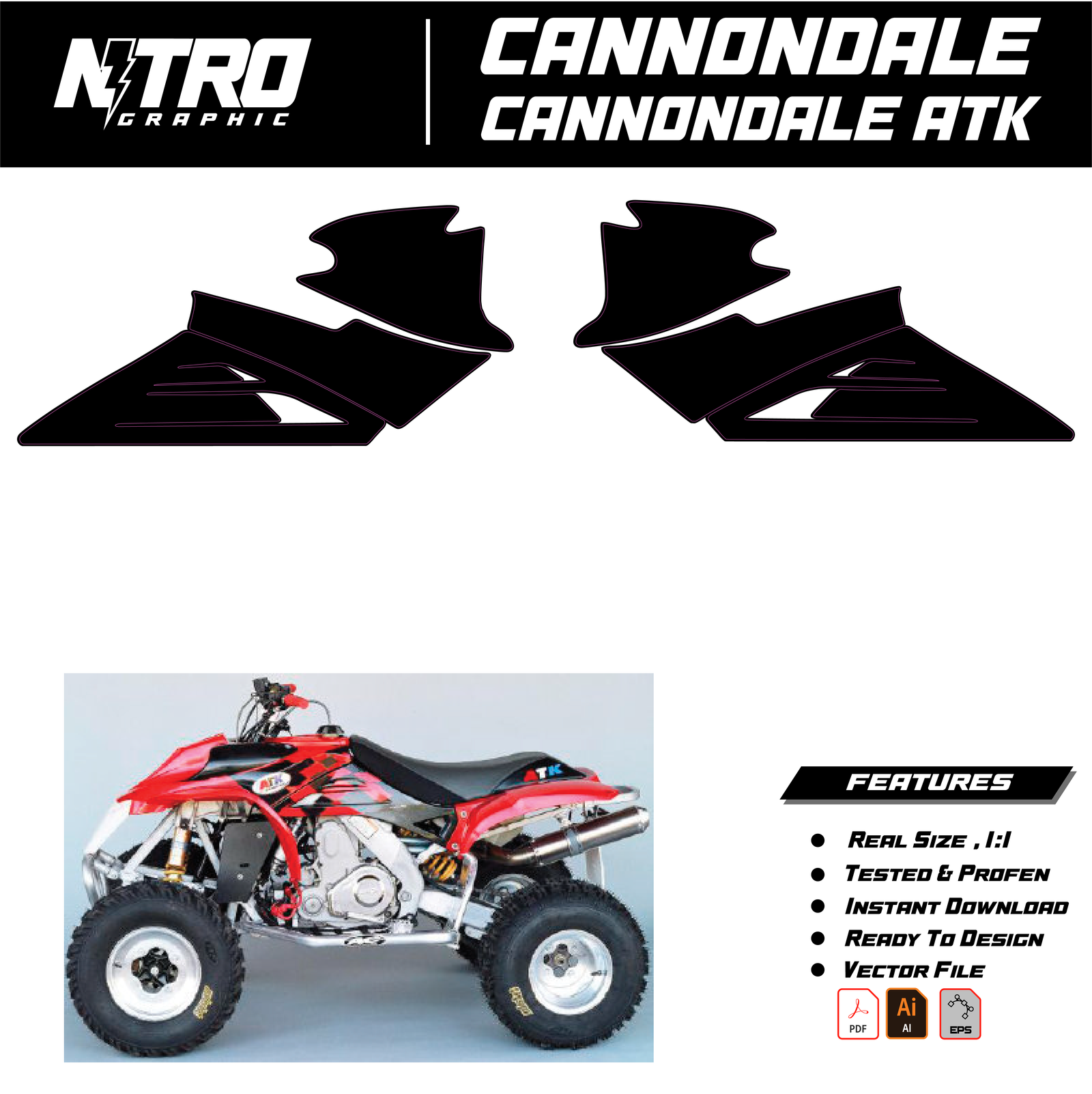 Our CANNONDALE ATK QUADS ATV Templates are manufactured to be easily placed on your vehicle and make it 100% unique. Our Vector Template is available in digital format. It is designed to be simply used with your graphic design software (Illustrator, Photoshop, Corel Draw, etc.).