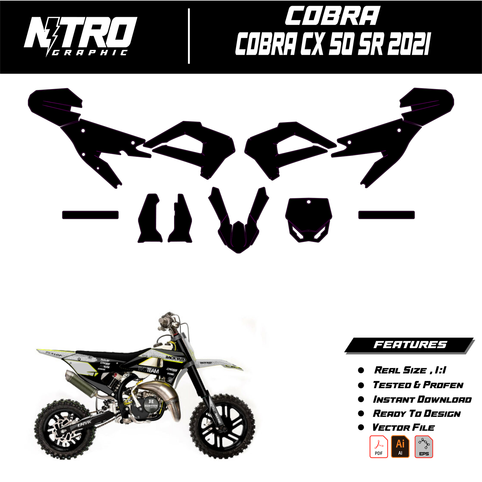 Our Cobra CX 50 SR 2021 Templates are manufactured to be easily placed on your vehicle and make it 100% unique. Our Vector Template is available in digital format. It is designed to be simply used with your graphic design software (Illustrator, Photoshop, Corel Draw, etc.).