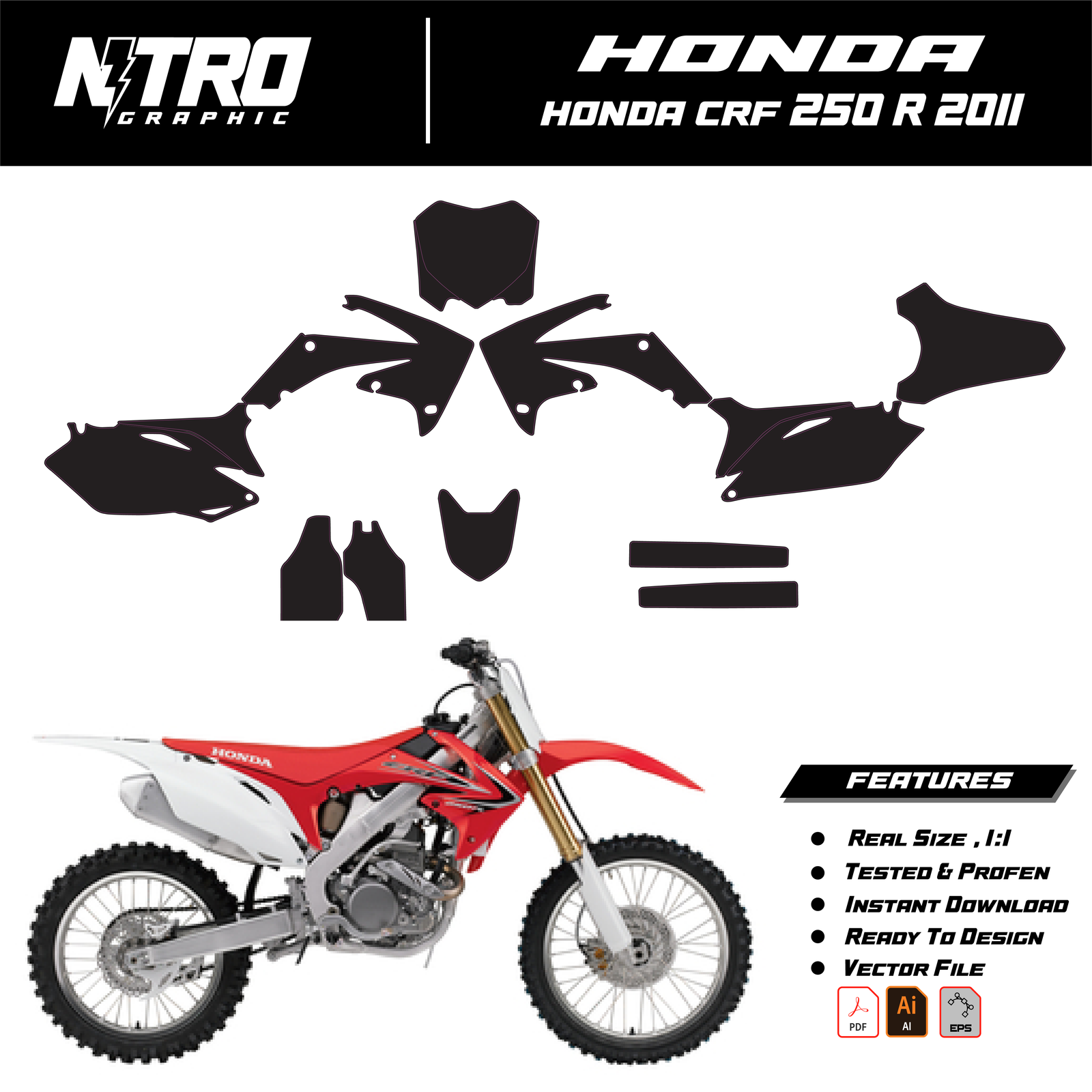 Our HONDA CRF 250 R 2011 Templates are manufactured to be easily placed on your vehicle and make it 100% unique. Our Vector Template is available in digital format. It is designed to be simply used with your graphic design software (Illustrator, Photoshop, Corel Draw, etc.).