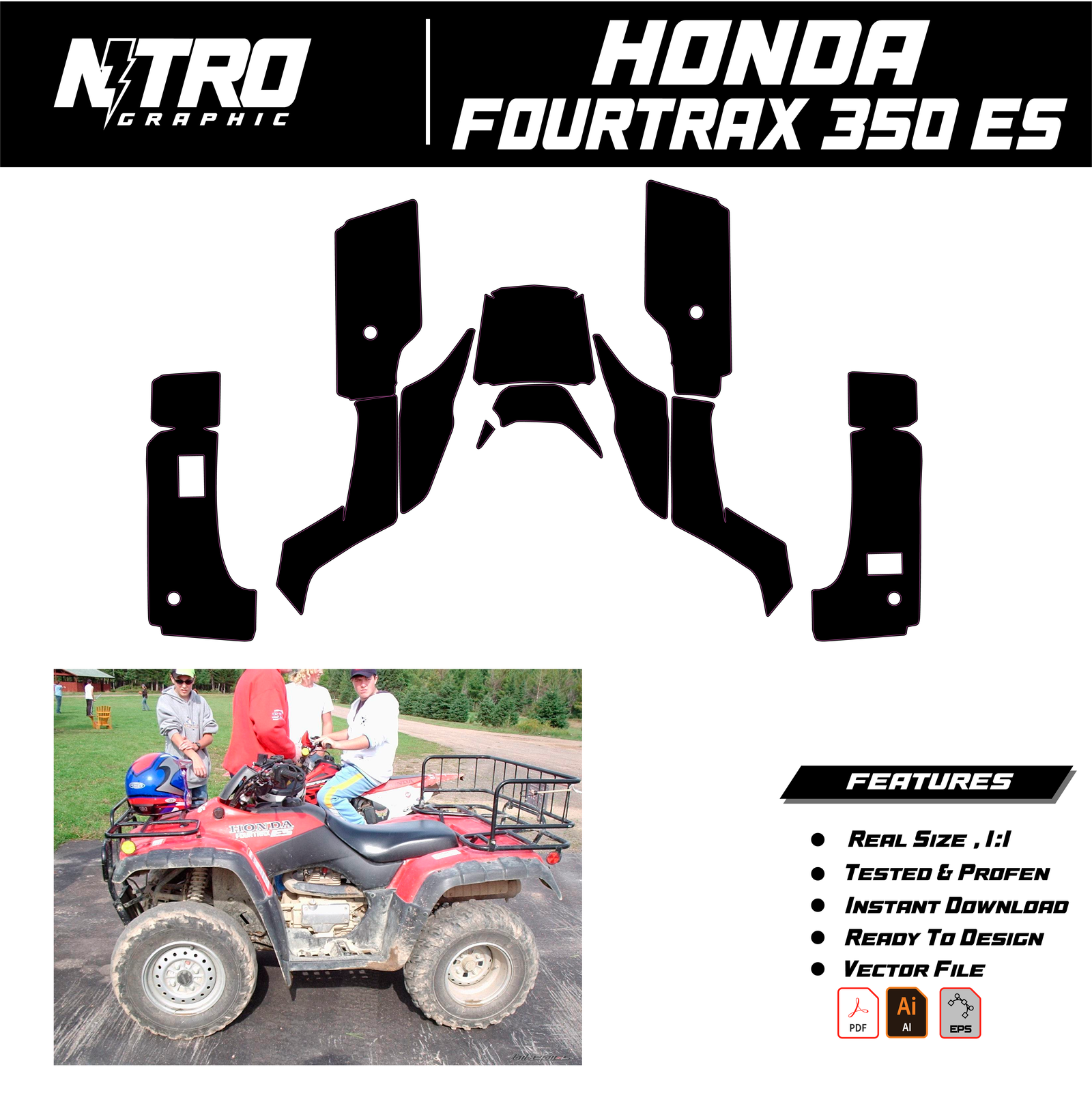Our HONDA FOURTRAX 350 ES QUADS ATV Templates are manufactured to be easily placed on your vehicle and make it 100% unique. Our Vector Template is available in digital format. It is designed to be simply used with your graphic design software (Illustrator, Photoshop, Corel Draw, etc.).