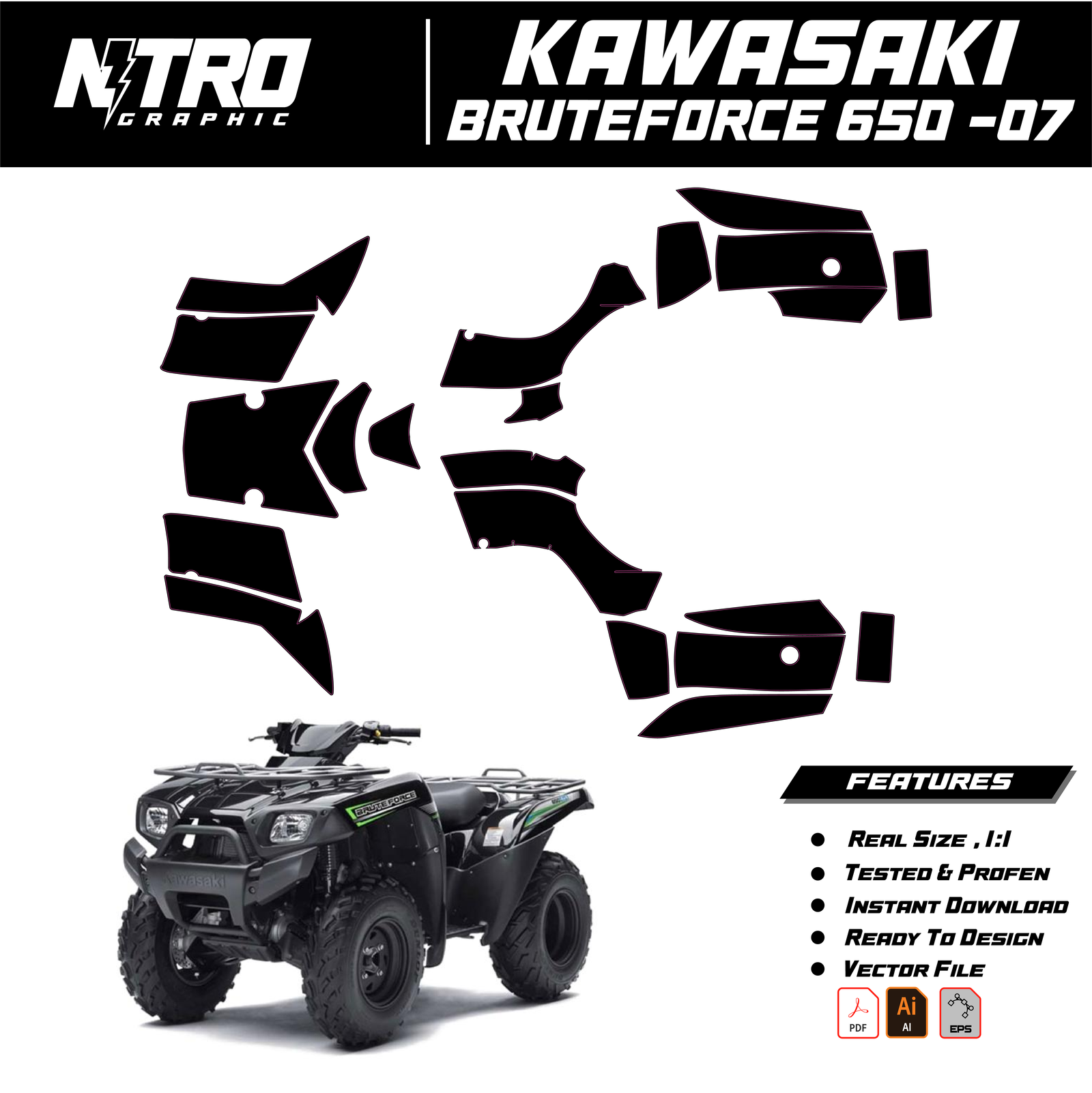 Our KAWASAKI BRUTE FORCE 650 2007 QUADS ATV Templates are manufactured to be easily placed on your vehicle and make it 100% unique. Our Vector Template is available in digital format. It is designed to be simply used with your graphic design software (Illustrator, Photoshop, Corel Draw, etc.).