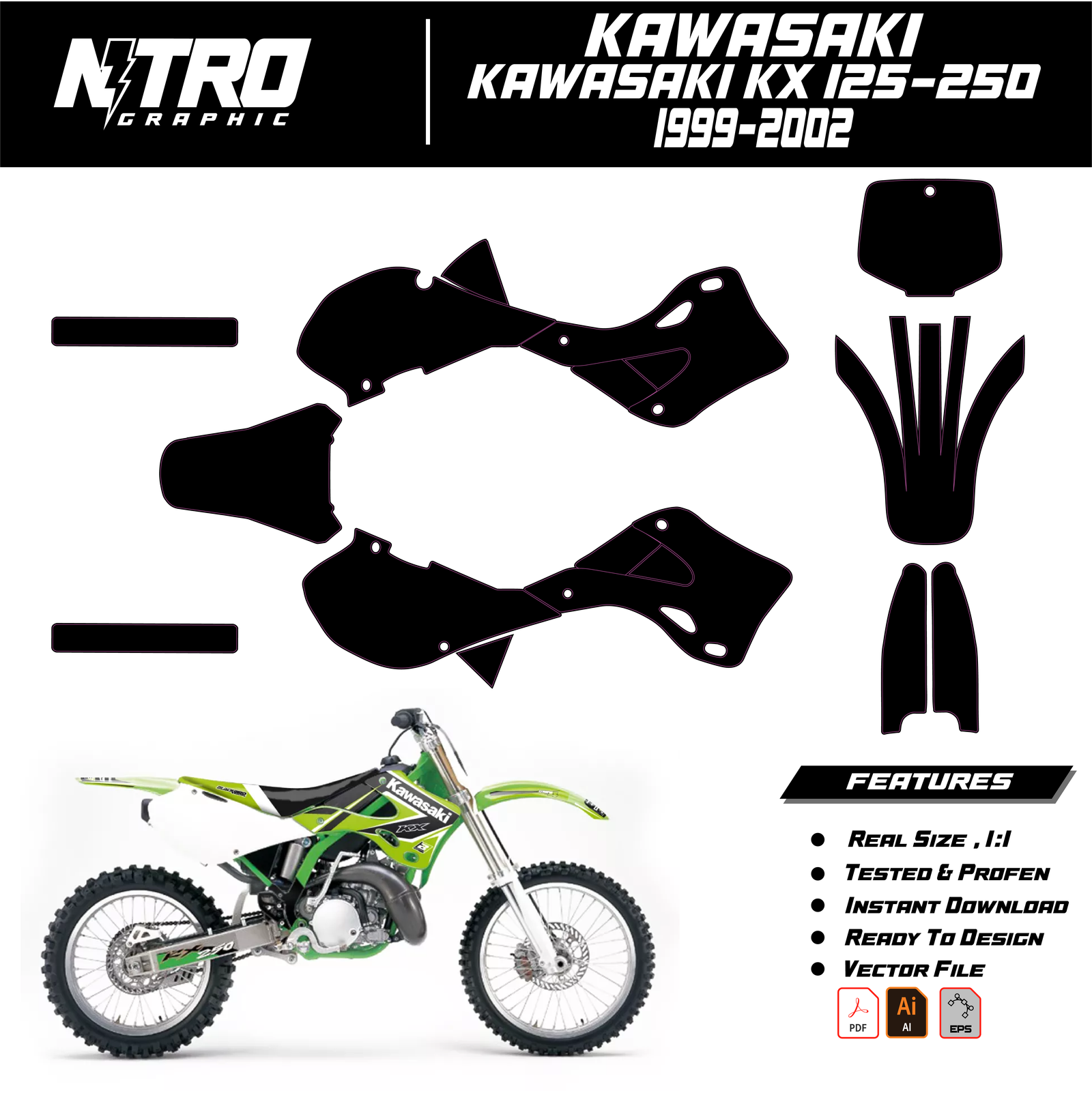 Our Kawasaki KX 125-250 1999 2000 2001 2002 Templates are manufactured to be easily placed on your vehicle and make it 100% unique. Our Vector Template is available in digital format. It is designed to be simply used with your graphic design software (Illustrator, Photoshop, Corel Draw, etc.).