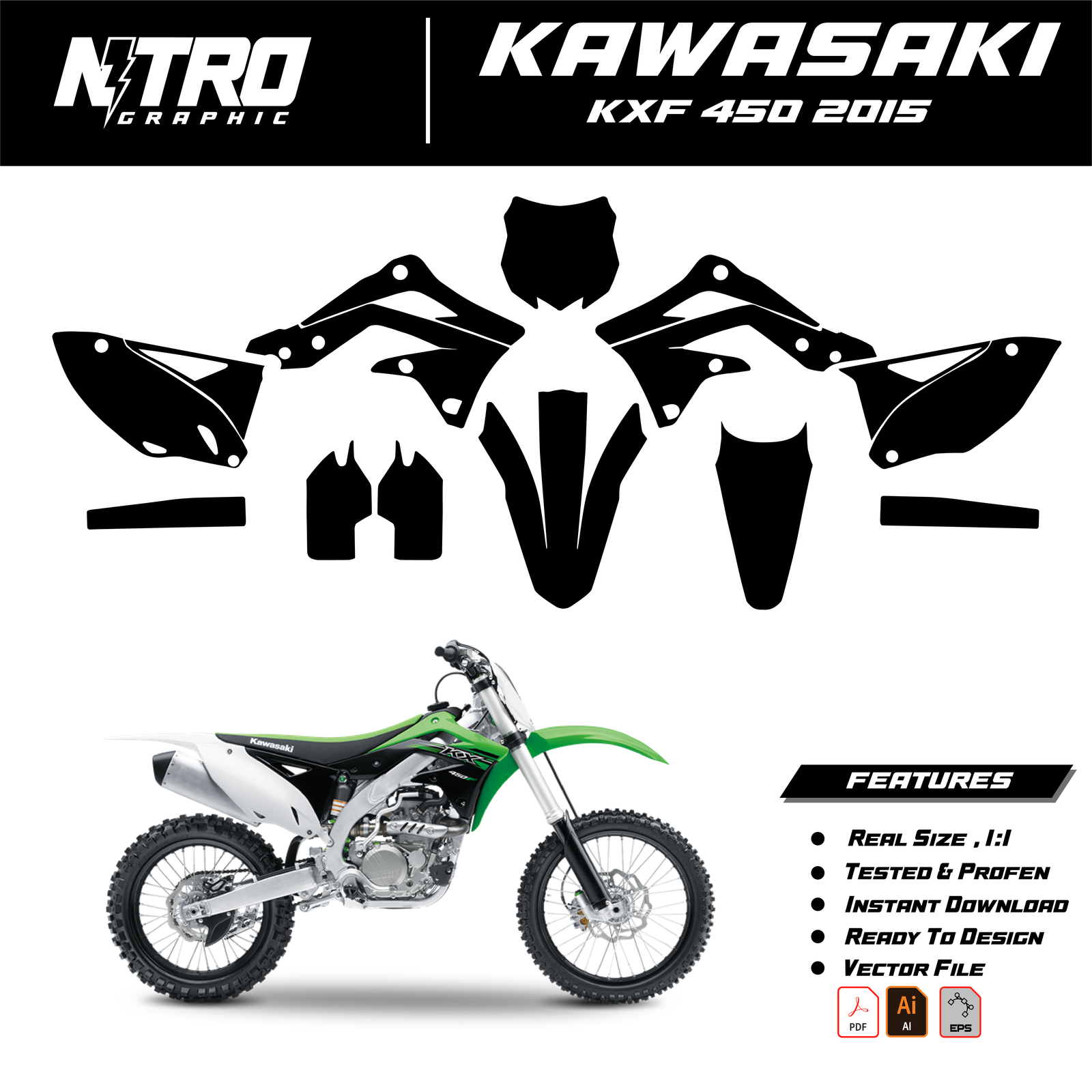 Our KAWASAKI KXF 450 2015 Templates are manufactured to be easily placed on your vehicle and make it 100% unique. Our Vector Template is available in digital format. It is designed to be simply used with your graphic design software (Illustrator, Photoshop, Corel Draw, etc.).