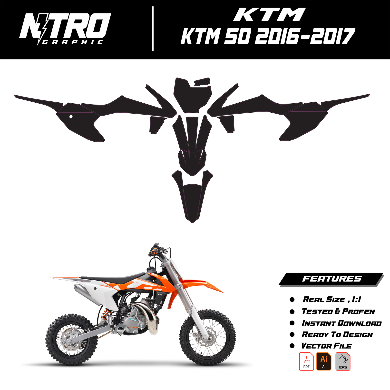 Our KTM 50 2016-2017 Templates are manufactured to be easily placed on your vehicle and make it 100% unique. Our Vector Template is available in digital format. It is designed to be simply used with your graphic design software (Illustrator, Photoshop, Corel Draw, etc.).