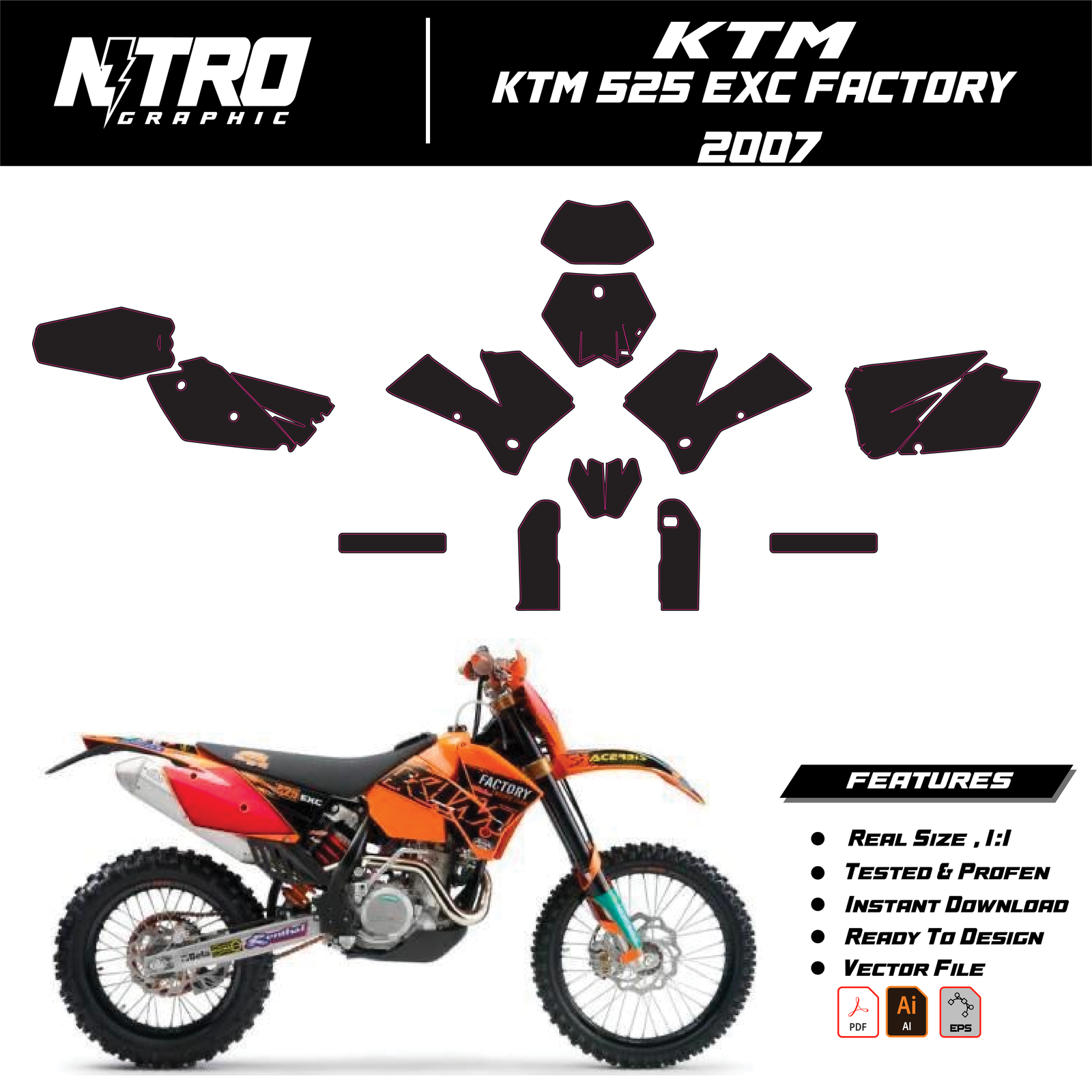 Our KTM 525 EXC Factory 2007 Templates are manufactured to be easily placed on your vehicle and make it 100% unique. Our Vector Template is available in digital format. It is designed to be simply used with your graphic design software (Illustrator, Photoshop, Corel Draw, etc.).