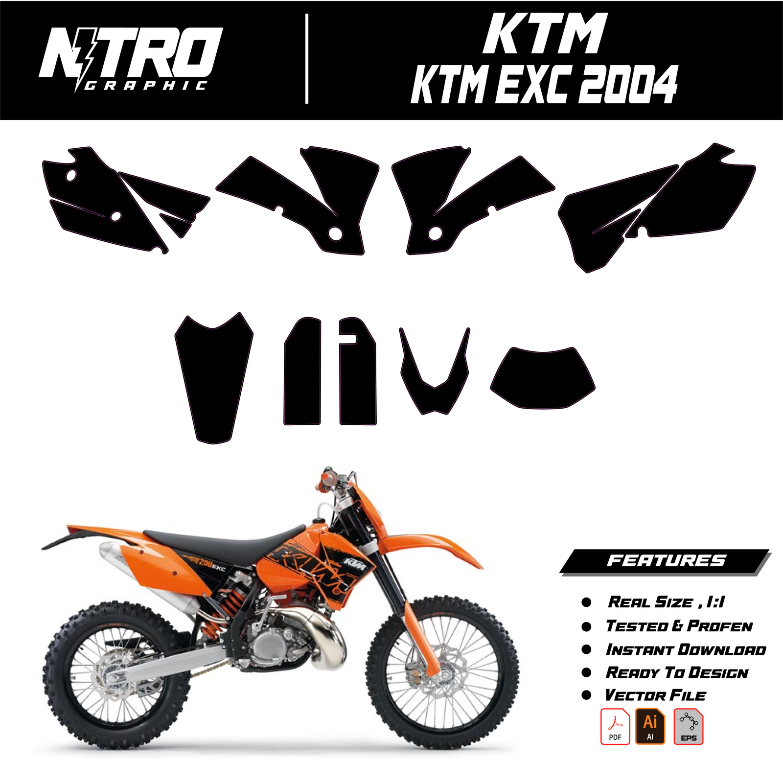 Our KTM EXC 2004 Templates are manufactured to be easily placed on your vehicle and make it 100% unique. Our Vector Template is available in digital format. It is designed to be simply used with your graphic design software (Illustrator, Photoshop, Corel Draw, etc.).