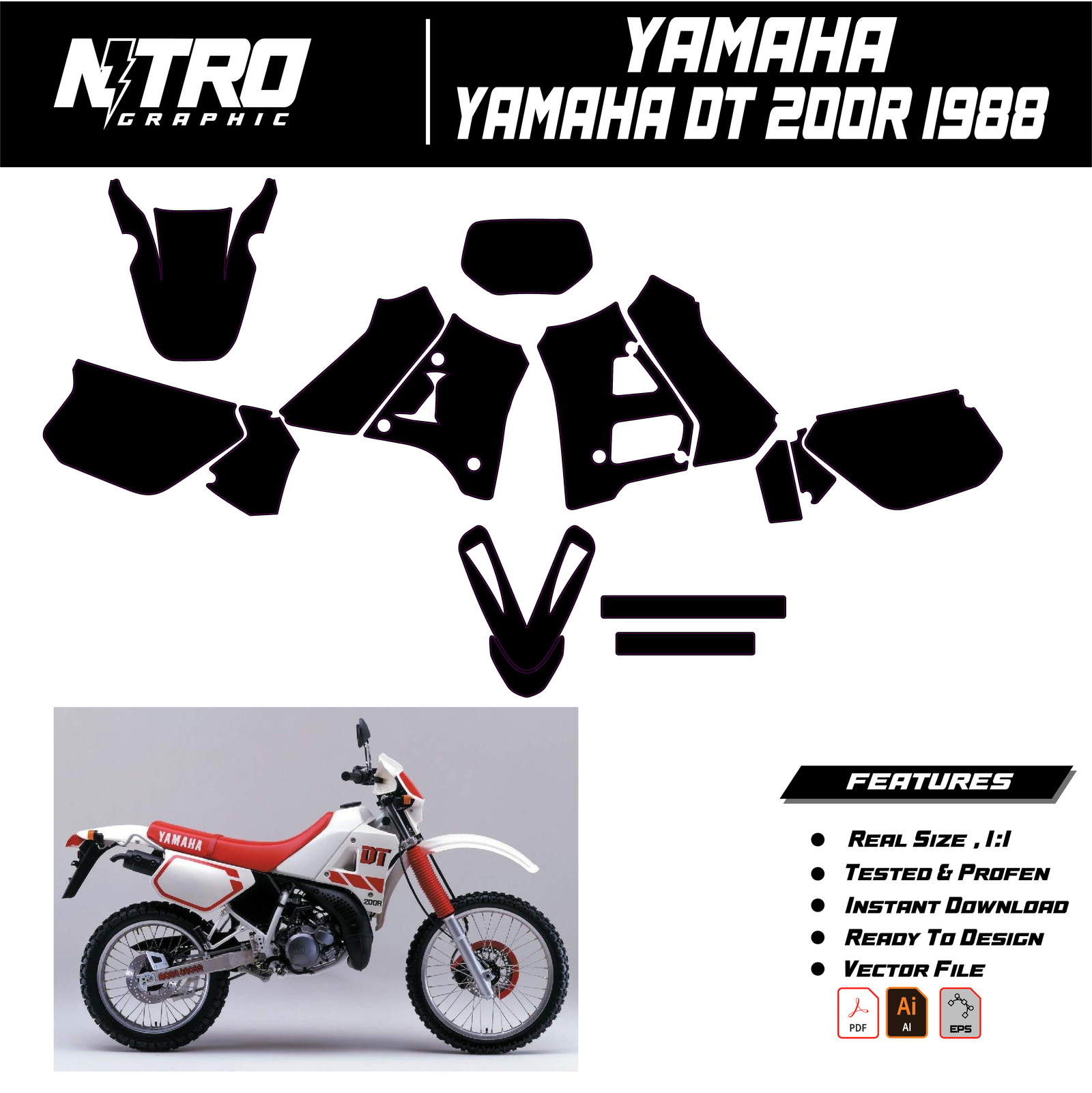 Our YAMAHA DT 200R 1988 Templates are manufactured to be easily placed on your vehicle and make it 100% unique. Our Vector Template is available in digital format. It is designed to be simply used with your graphic design software (Illustrator, Photoshop, Corel Draw, etc.).