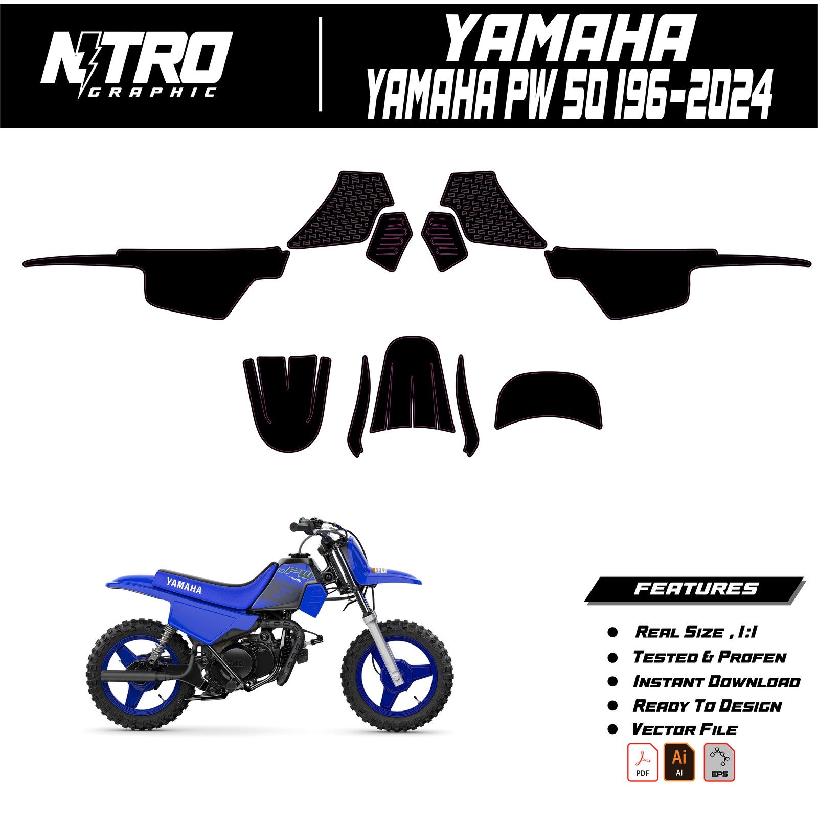 Our YAMAHA PW 50 1996 1997 1998 1999 2000 2001 2002 2003 2004 2005 2006 2007 2008 2009 – 2024 Templates are manufactured to be easily placed on your vehicle and make it 100% unique. Our Vector Template is available in digital format. It is designed to be simply used with your graphic design software (Illustrator, Photoshop, Corel Draw, etc.).