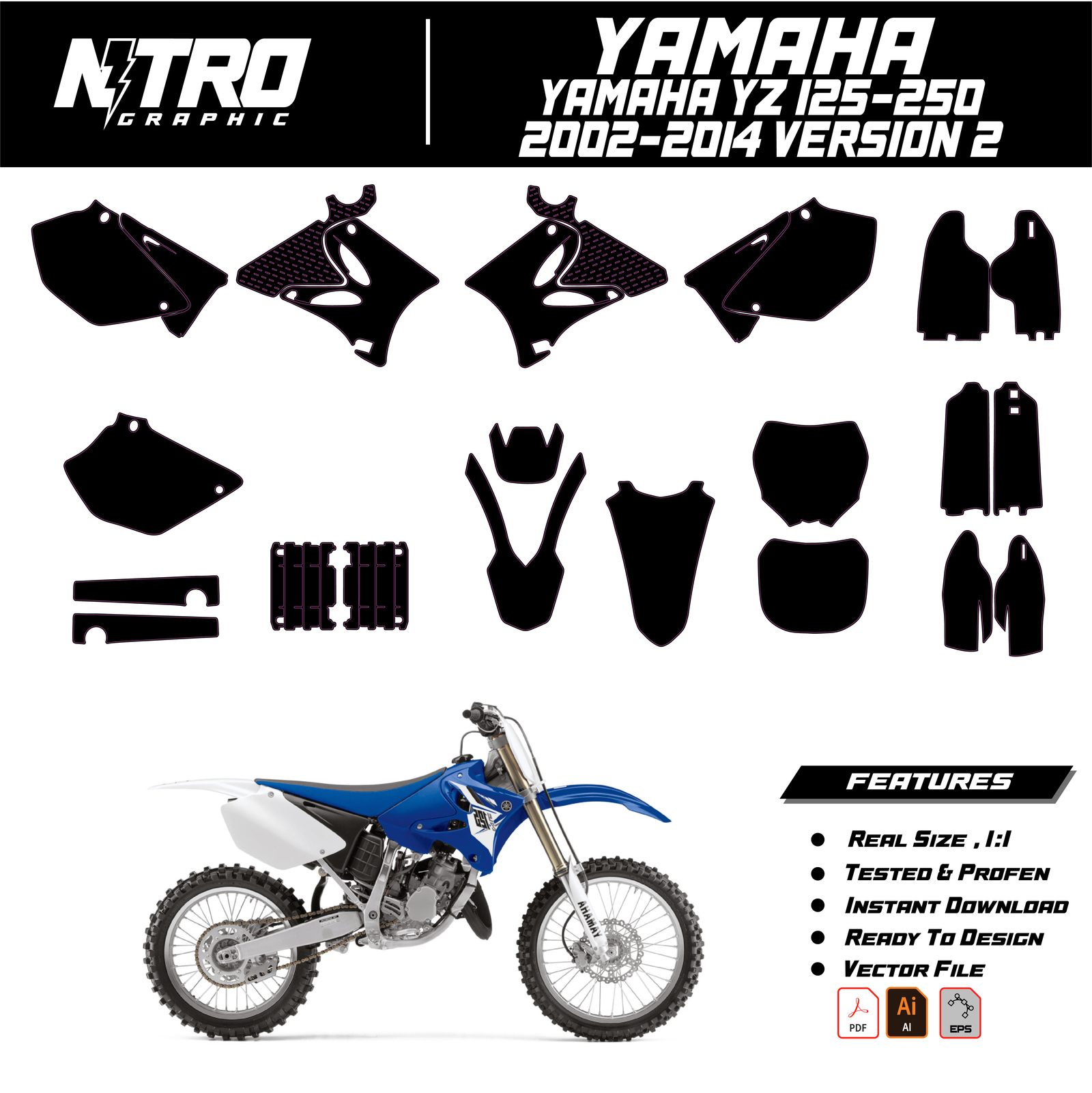 Our Yamaha YZ 125-250 2002 2003 2004 2005 – 2014 VERSION 2 Templates are manufactured to be easily placed on your vehicle and make it 100% unique. Our Vector Template is available in digital format. It is designed to be simply used with your graphic design software (Illustrator, Photoshop, Corel Draw, etc.).