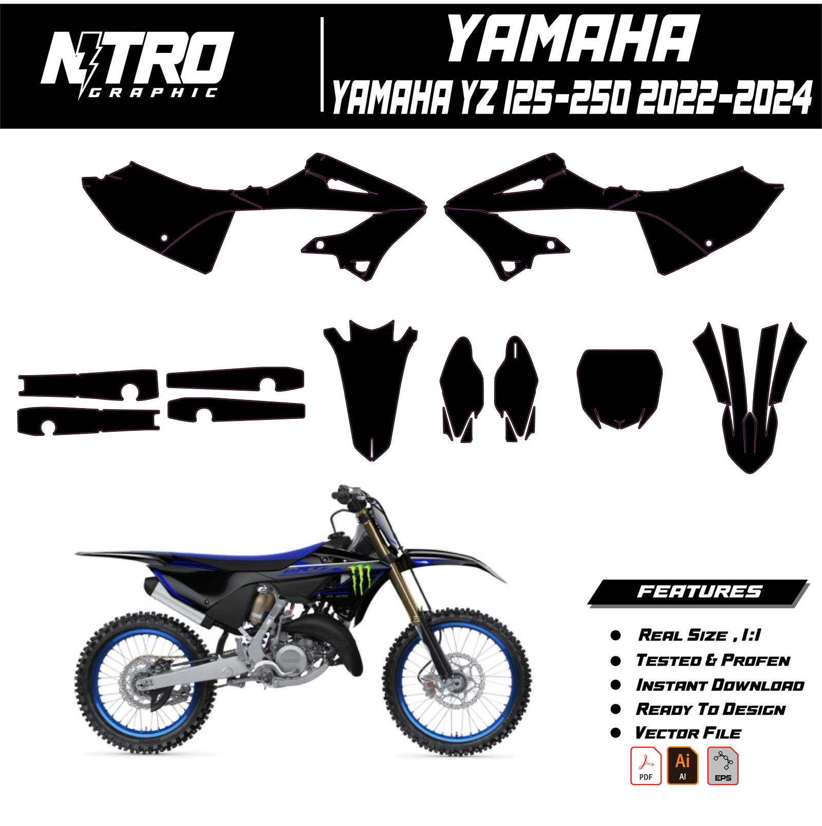 Our YAMAHA YZ 125-250 2022 2023 2024 Templates are manufactured to be easily placed on your vehicle and make it 100% unique. Our Vector Template is available in digital format. It is designed to be simply used with your graphic design software (Illustrator, Photoshop, Corel Draw, etc.).