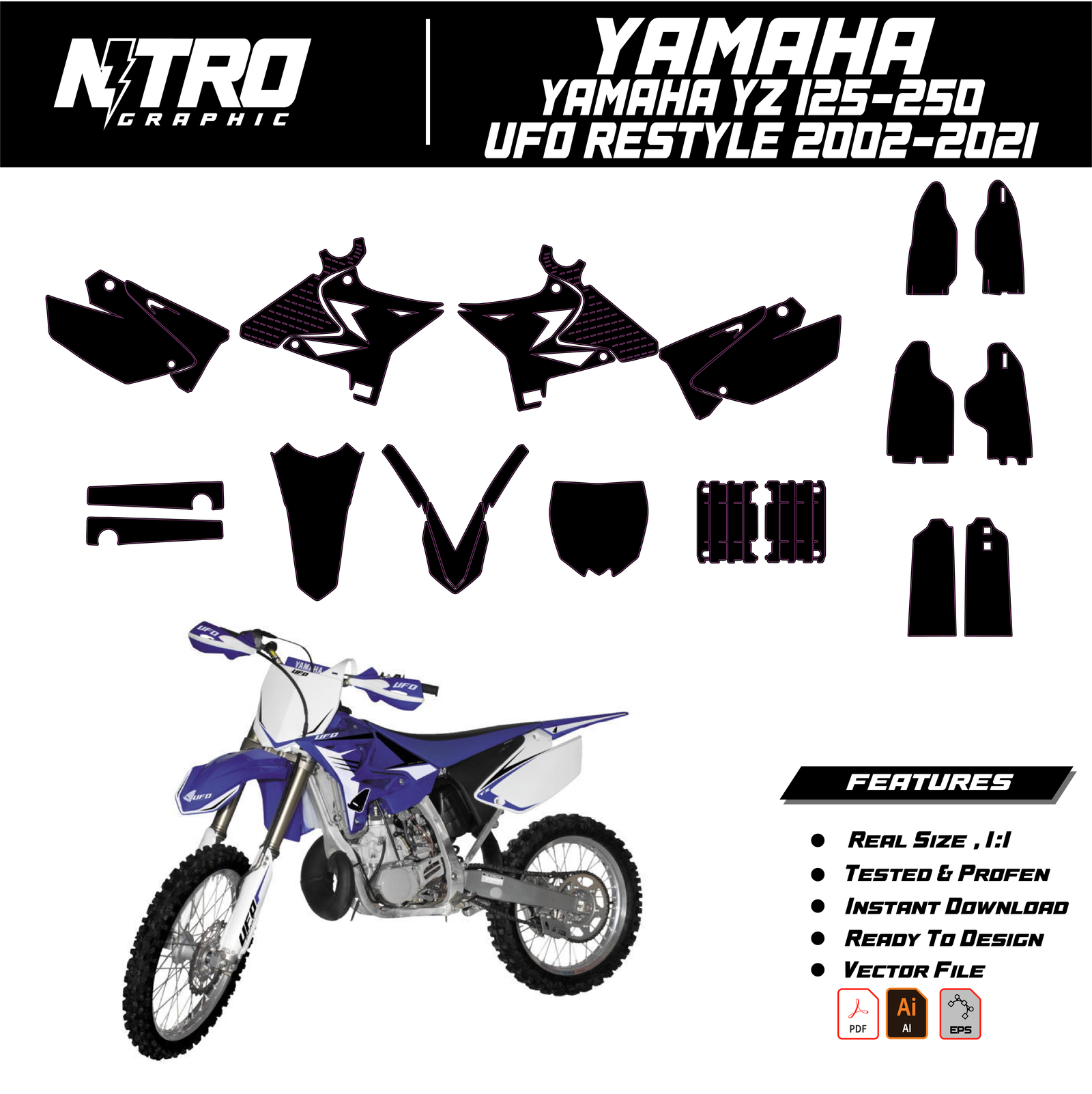 Our Yamaha YZ 125-250 UFO RESTYLE 2002 – 2021 Templates are manufactured to be easily placed on your vehicle and make it 100% unique. Our Vector Template is available in digital format. It is designed to be simply used with your graphic design software (Illustrator, Photoshop, Corel Draw, etc.).