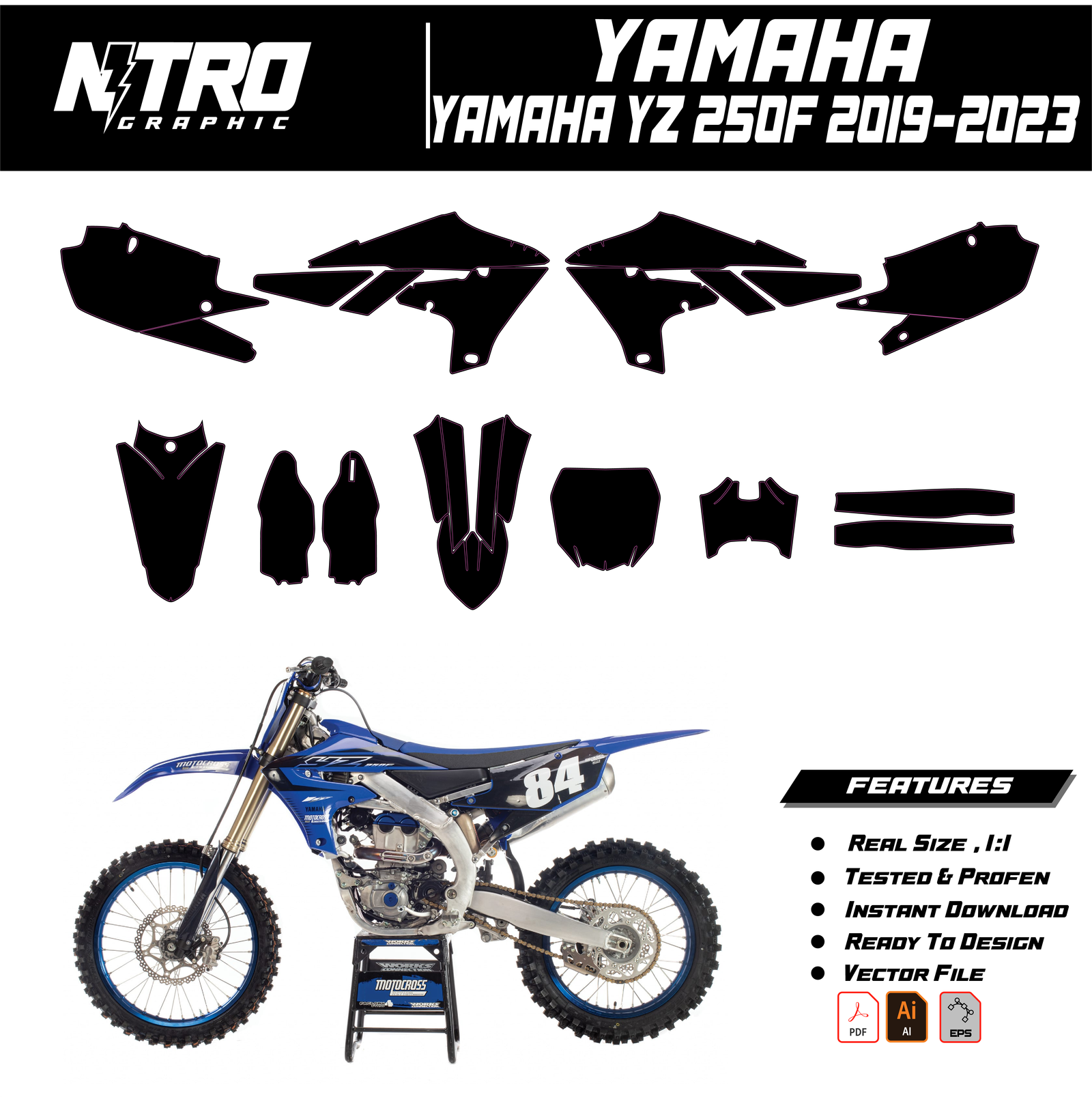 Our YAMAHA YZ 250F 2019 2020 2021 2022 2023 Templates are manufactured to be easily placed on your vehicle and make it 100% unique. Our Vector Template is available in digital format. It is designed to be simply used with your graphic design software (Illustrator, Photoshop, Corel Draw, etc.).
