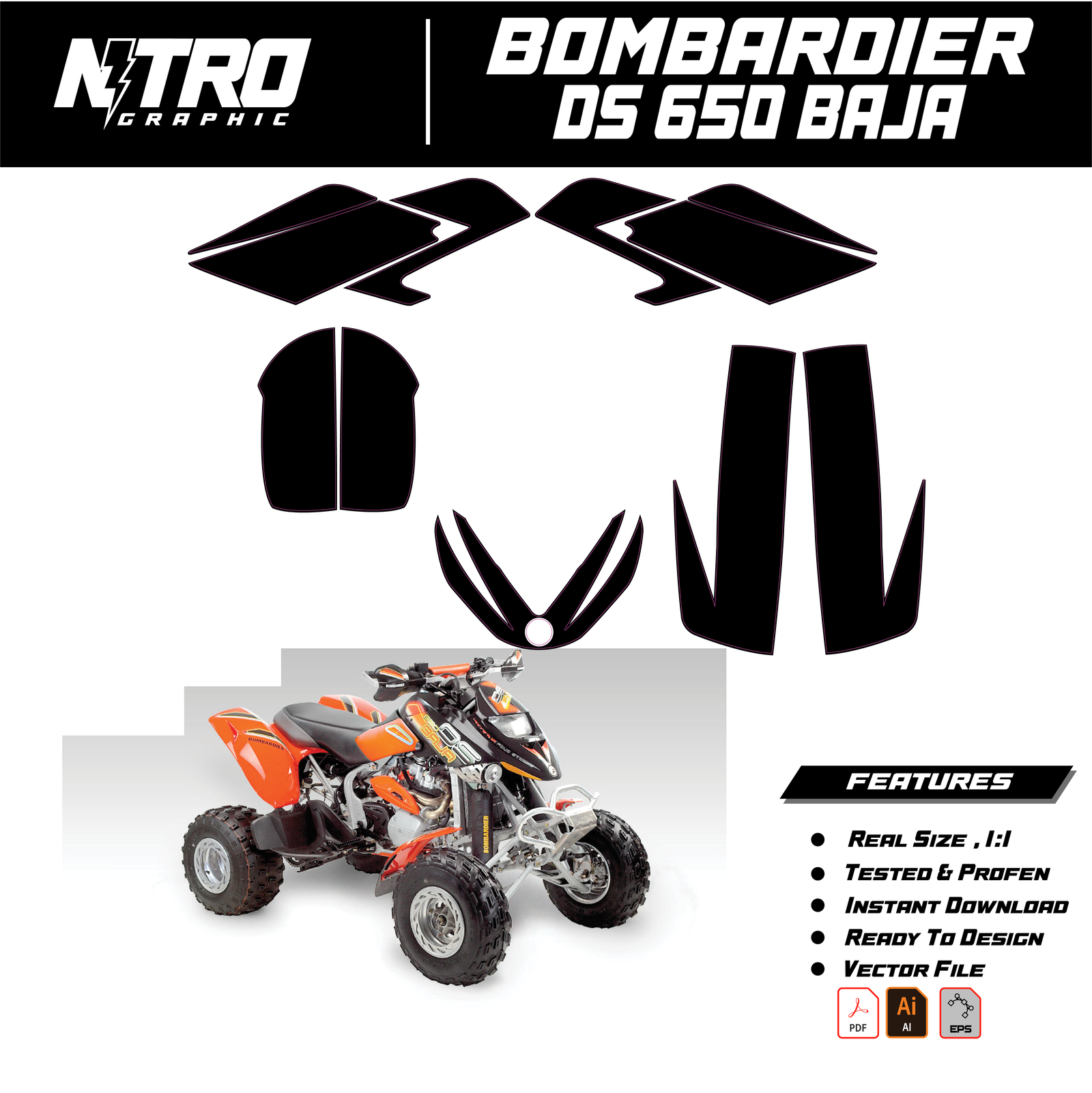 Our BOMBARDIER DS 650 BAJA QUADS ATV Templates are manufactured to be easily placed on your vehicle and make it 100% unique. Our Vector Template is available in digital format. It is designed to be simply used with your graphic design software (Illustrator, Photoshop, Corel Draw, etc.).